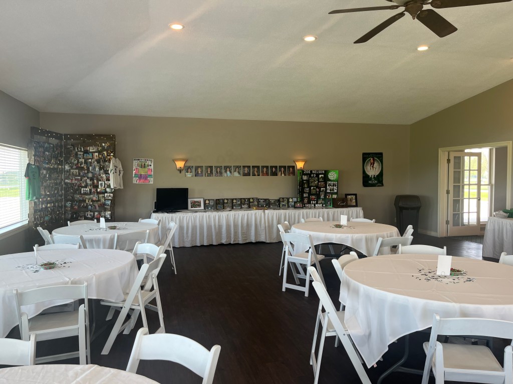 We have a full service bar and banquet room overlooking hole nine that holds approximately 90 people.